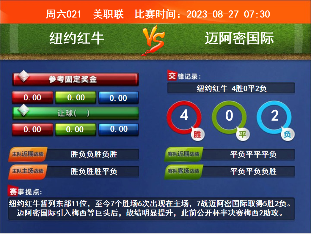 比賽時間:2023-08-27 07:30賽事提點:紐約紅牛暫列東部11位,至今7個勝場6次出現在主場,7戰(zhàn)邁阿密國際取得5勝2負。邁阿密國際引入梅西等巨頭后,戰(zhàn)績明顯提升,此前公開杯半決賽梅西2助攻。