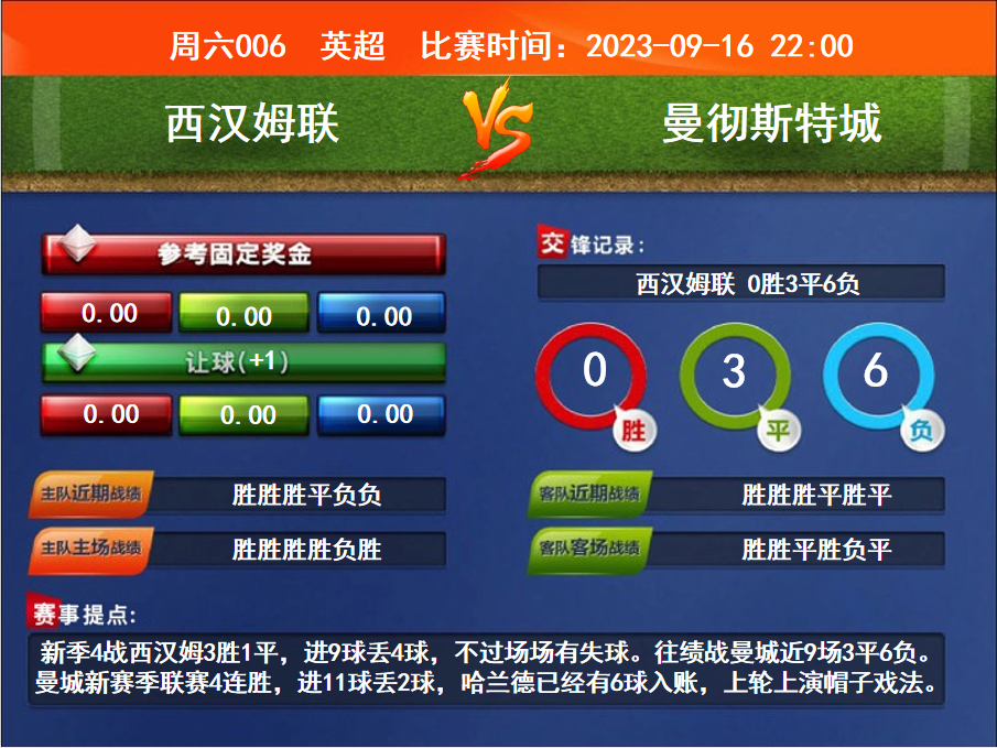 比賽時(shí)間:2023-09-16 22:00賽事提點(diǎn):新季4戰(zhàn)西漢姆3勝1平,進(jìn)9球丟4球,不過場(chǎng)場(chǎng)有失球。往績(jī)戰(zhàn)曼城近9場(chǎng)3平6負(fù)。曼城新賽季聯(lián)賽4連勝,進(jìn)11球丟2球,哈蘭德已經(jīng)有6球入賬,上輪上演帽子戲法。