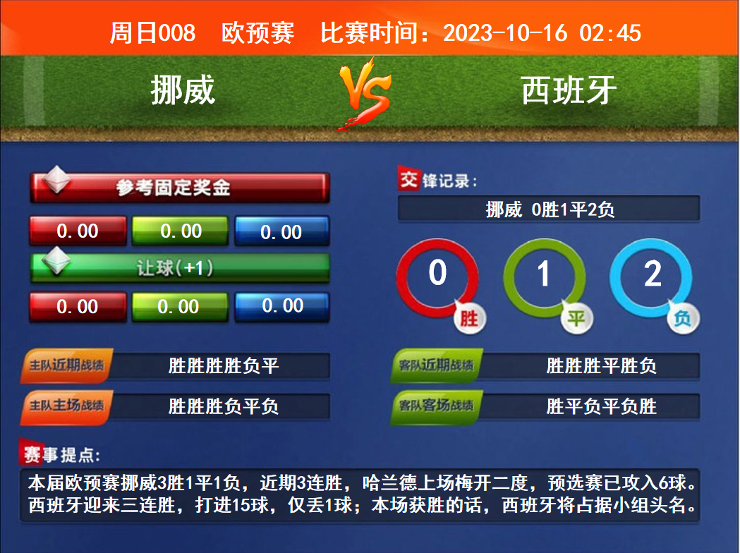 比賽時間:2023-10-16 02:45賽事提點:本屆歐預賽挪威3勝1平1負,近期3連勝,哈蘭德上場梅開二度,預選賽已攻入6球。西班牙迎來三連勝,打進15球,僅丟1球;本場獲勝的話,西班牙將占據(jù)小組頭名。