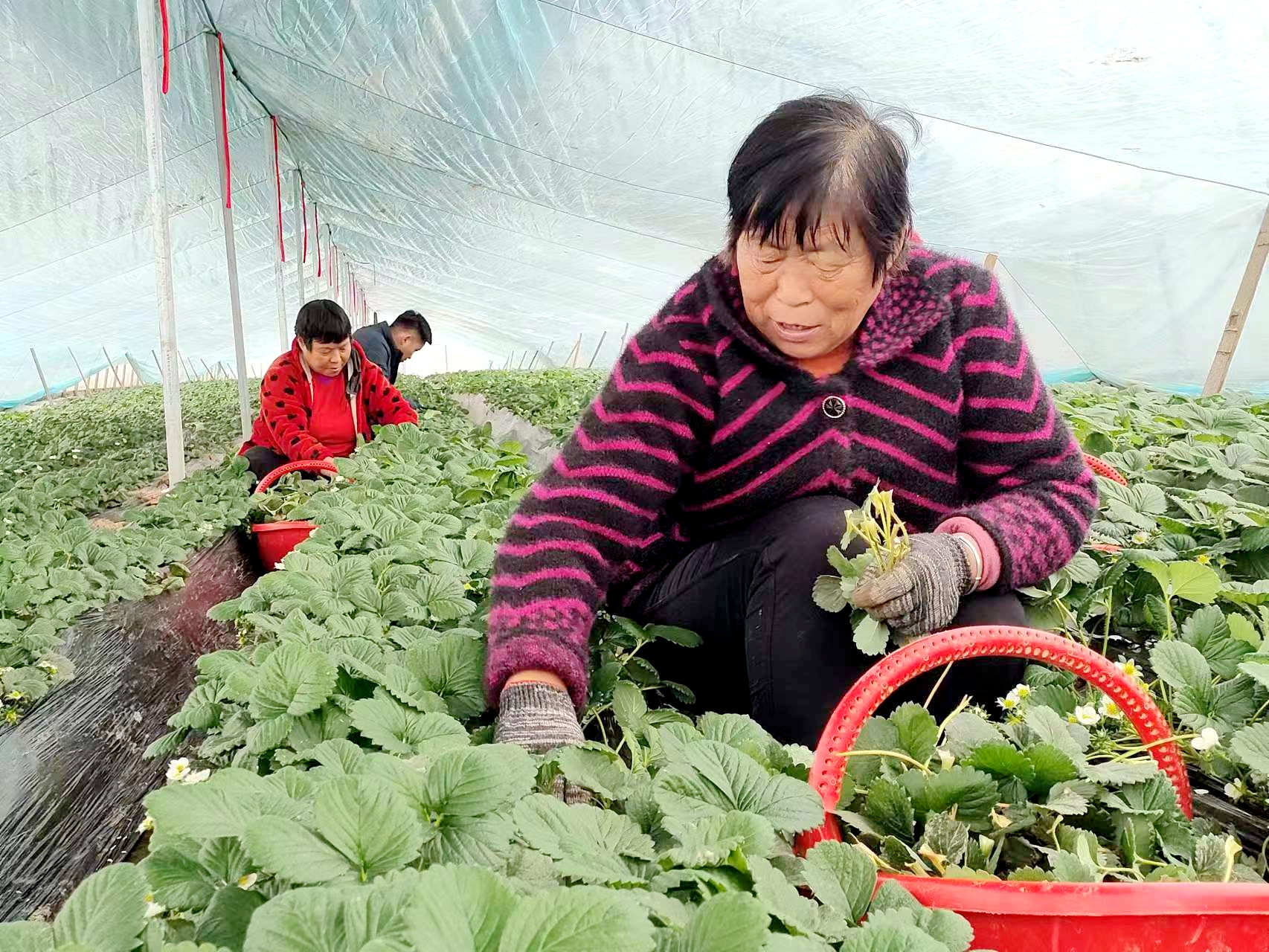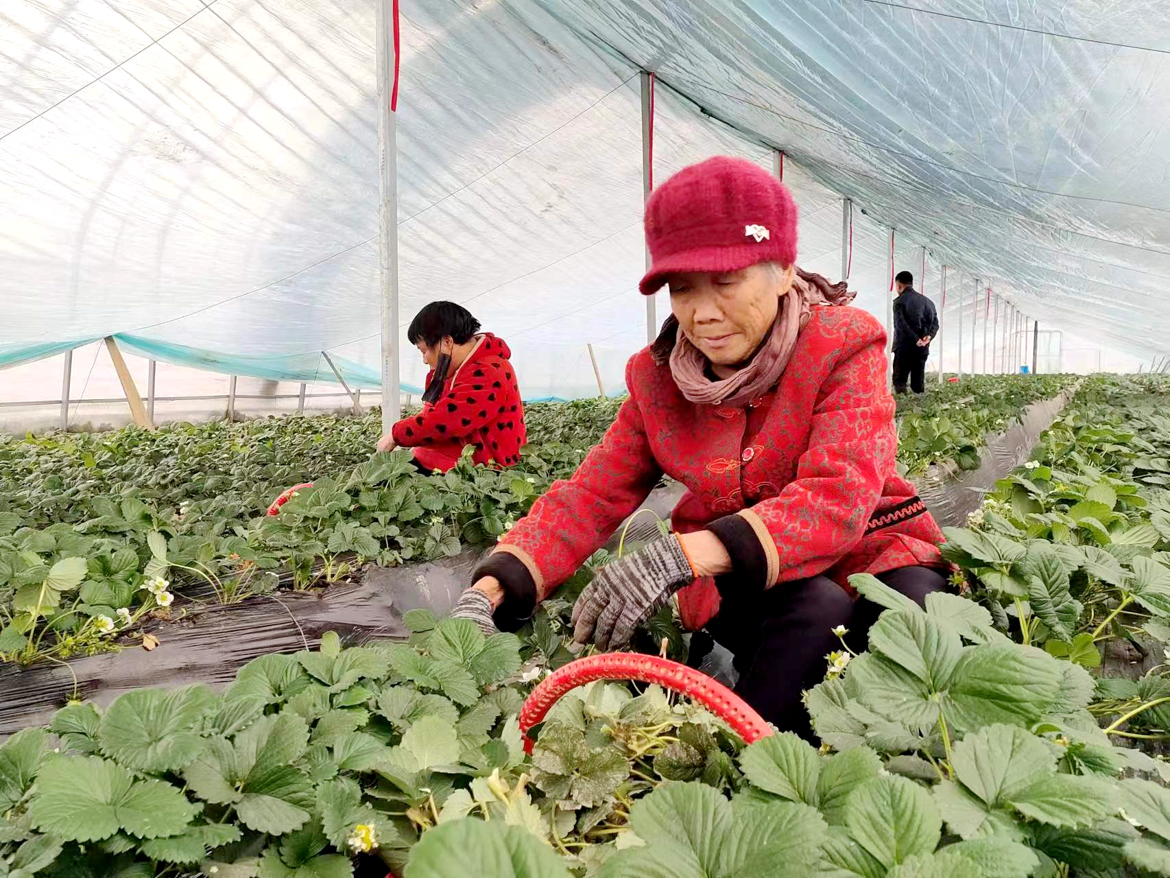 在田廣水的草莓采摘園,一股清香撲鼻而來(lái)。綠油油的草莓葉下,一顆顆鮮紅欲滴的草莓長(zhǎng)勢(shì)喜人,十分誘人。這里的20多畝草莓已經(jīng)開(kāi)始結(jié)果成熟上市?!俺醵乃贩N本來(lái)很少,我們大棚種植的‘紅顏’草莓香甜、肉厚、口感好,大人孩子都很喜歡吃?!碧飶V水說(shuō),草莓園成熟季雇用工人近30人,全部來(lái)自村里的留守婦女、老人及脫貧監(jiān)測(cè)戶(hù)。