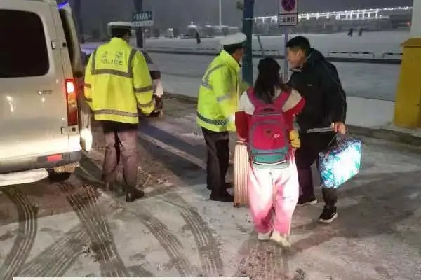 當(dāng)男子的女兒順利到達(dá)高鐵站后,交警們又將他送回原地??吹骄仍藛T已經(jīng)到達(dá),交警們再次投入到雪夜的巡邏中。他們的熒光黃制服與白雪交相輝映,成為雪夜里最溫暖的色彩。②2