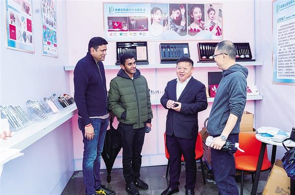 11月16日,鹿邑縣化妝刷企業(yè)的工作人員向兩名外國客戶(左一、左二)介紹產(chǎn)品。當(dāng)天,鹿邑縣首屆美妝、化妝刷展銷會(huì)在弘道苑廣場開幕。本屆展銷會(huì)為期3天,吸引100多家企業(yè)參展。 ...[詳細(xì)]