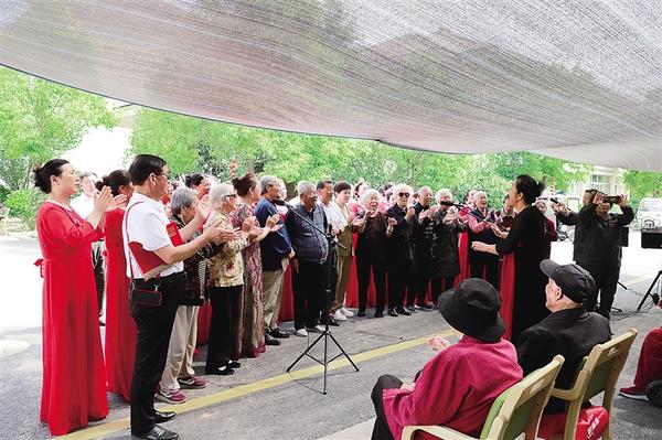 4月27日,周口市退伍軍人合唱團(tuán)到川匯區(qū)太昊路老年護(hù)理院慰問演出。合唱團(tuán)成員與老人一起演唱《我的祖國》。