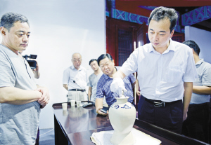 7月10日,周口市委常委、縣委書記、縣長朱良才在長軍博物館落戶鹿邑歡迎儀式上,觀看藏品“唐青花塔式罐”。(閆子健 攝)
