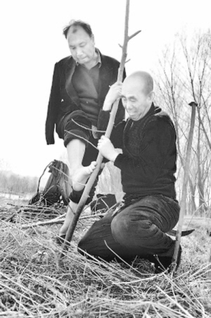 賈文其用腳將樹枝插在洞中,賈海霞雙手用力將它插入泥土中。